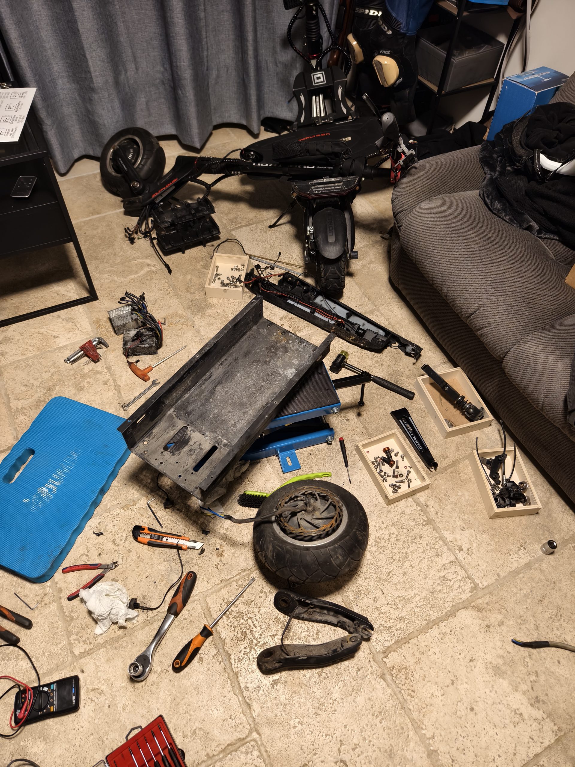 Ces modifications apportent une meilleure précision de pilotage, une sensation de contrôle accrue et un niveau de sécurité supérieur. Une machine unique se construit. Au final, ce projet dépasse largement la simple réparation. C’est une reconstruction complète mêlant mécanique, électronique de puissance et fabrication artisanale. Partir d’une trottinette brûlée pour en faire une machine entièrement reconstruite, personnalisée et beaucoup plus performante est une aventure technique passionnante.Cette Dualtron Thunder 2 n’est plus simplement une trottinette électrique : c’est désormais un prototype roulant, fruit de nombreuses heures de travail, d’expérimentation et de passion pour la mécanique et l’électronique.