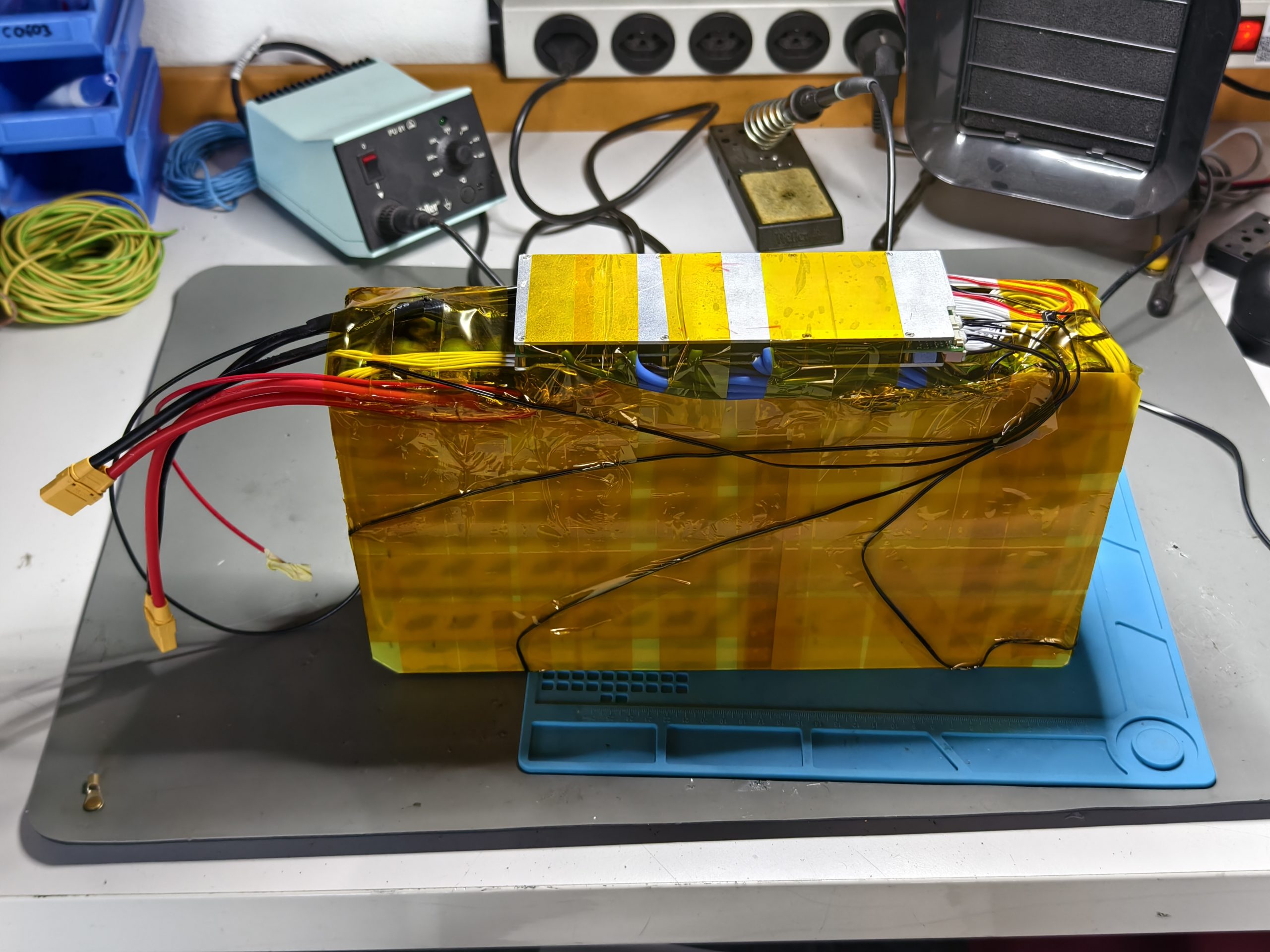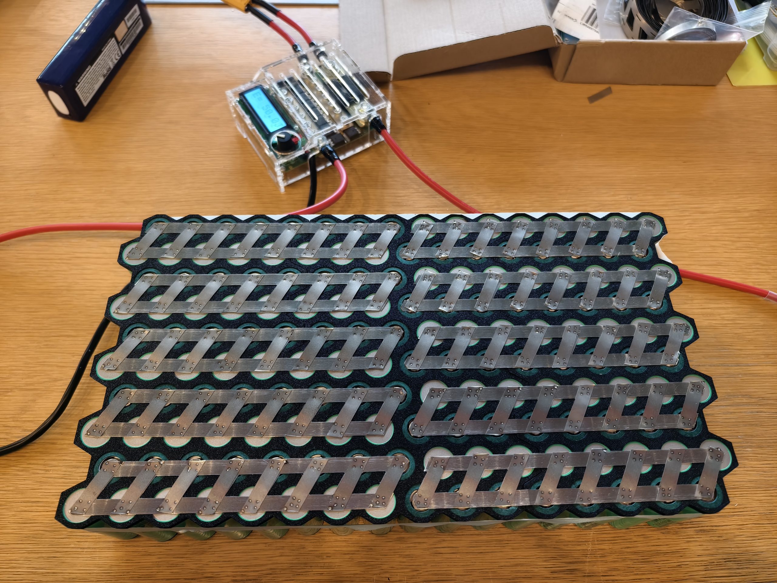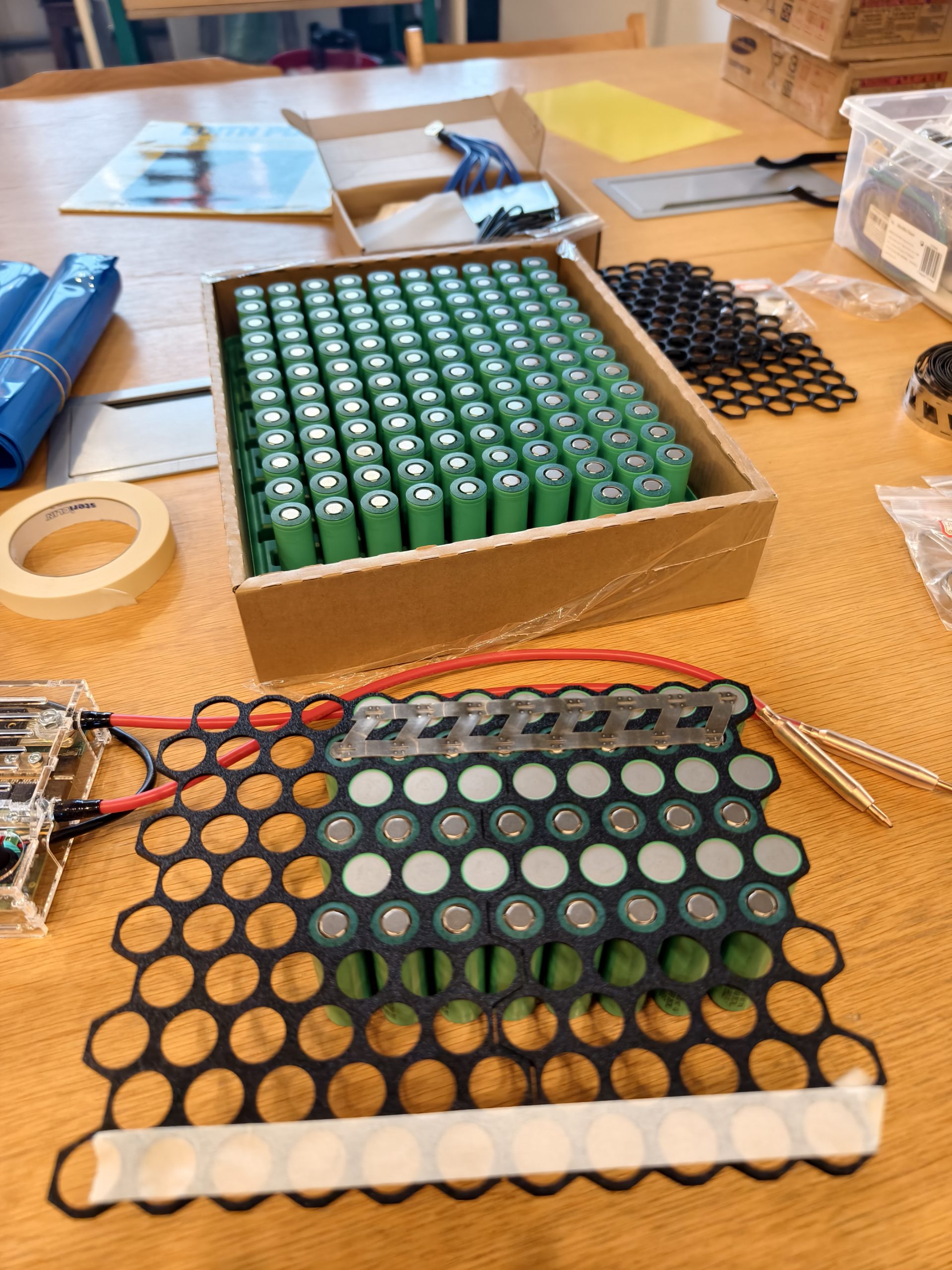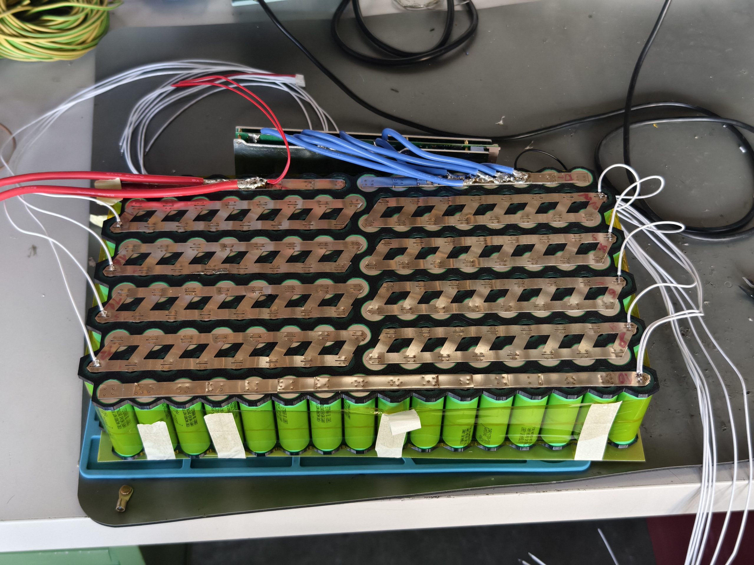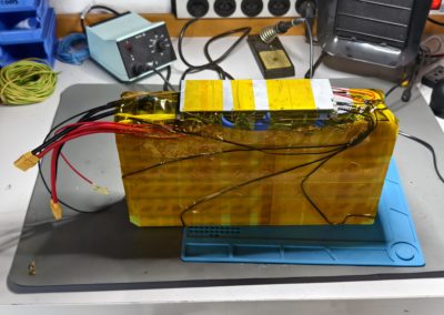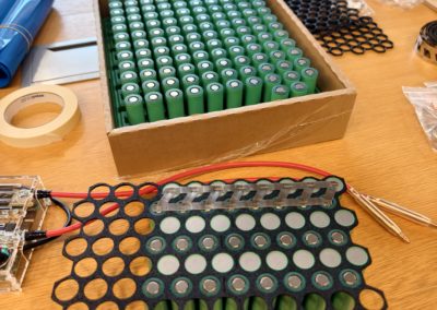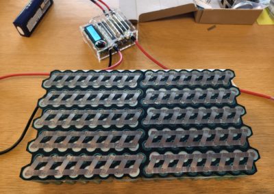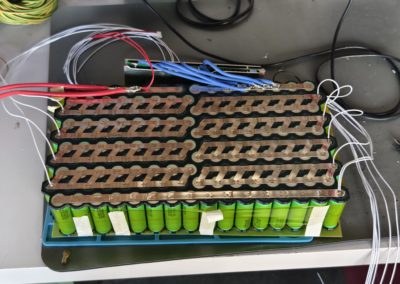 La première étape a été une remise à zéro complète. La trottinette a été entièrement démontée, chaque pièce inspectée, nettoyée et remise en état lorsque c’était possible. Le châssis a ensuite reçu une nouvelle peinture, afin de repartir sur une base propre, solide et durable. Ce travail de restauration a permis de transformer une machine endommagée en une plateforme prête à accueillir des composants bien plus performants que ceux d’origine. Le cœur du projet est sans doute la batterie. Une batterie entièrement fabriquée à la main. Plutôt que d’utiliser un pack existant, j’ai choisi de concevoir et assembler une batterie sur mesure. Elle est composée de 160 cellules 21700, soigneusement soudées à la main au Fablab, pour former un pack 72 V – 40 Ah. Ce type de configuration offre à la fois une grande réserve d’énergie et une capacité de décharge importante, capable d’alimenter une motorisation bien plus exigeante.Construire cette batterie a été l’une des étapes les plus longues et minutieuses du projet, mais aussi l’une des plus gratifiantes. Des contrôleurs programmables haute performance y sont ajoutés.