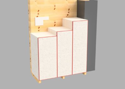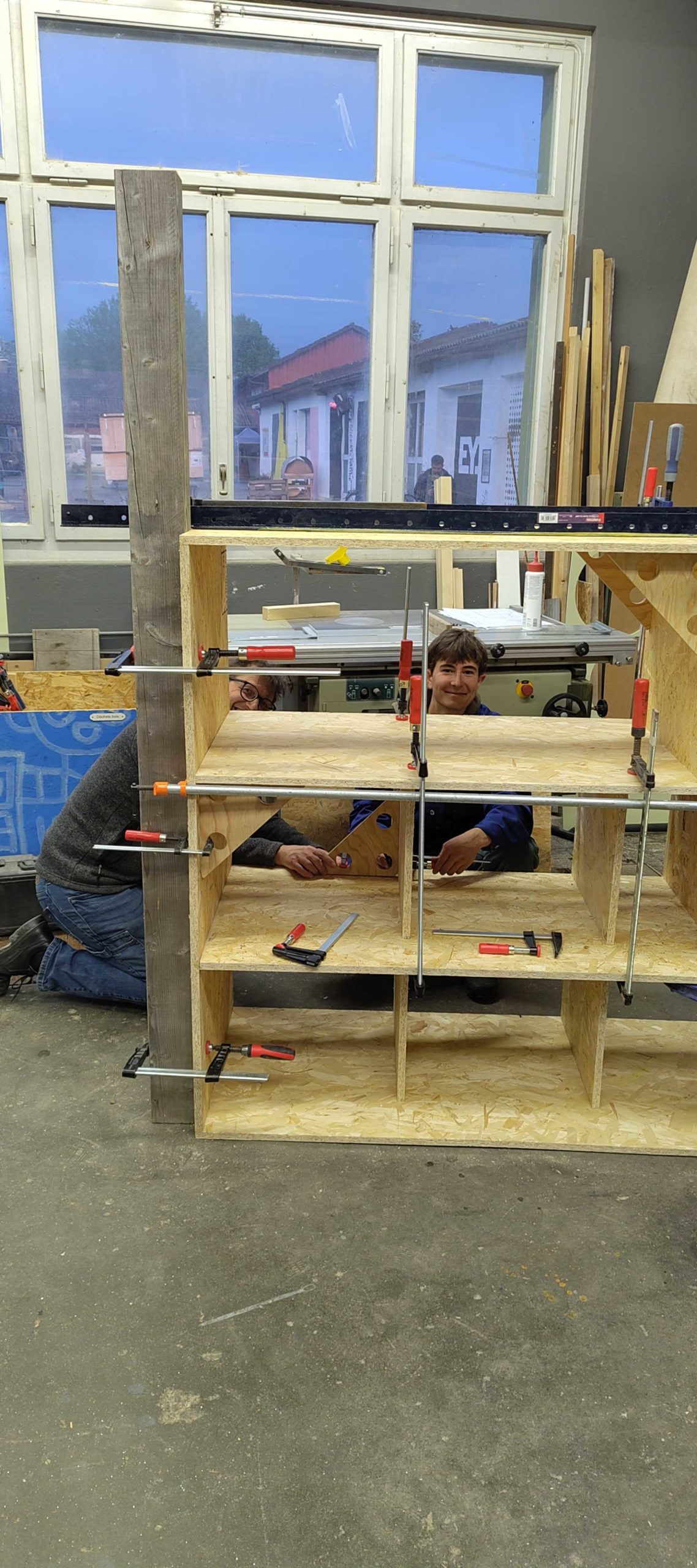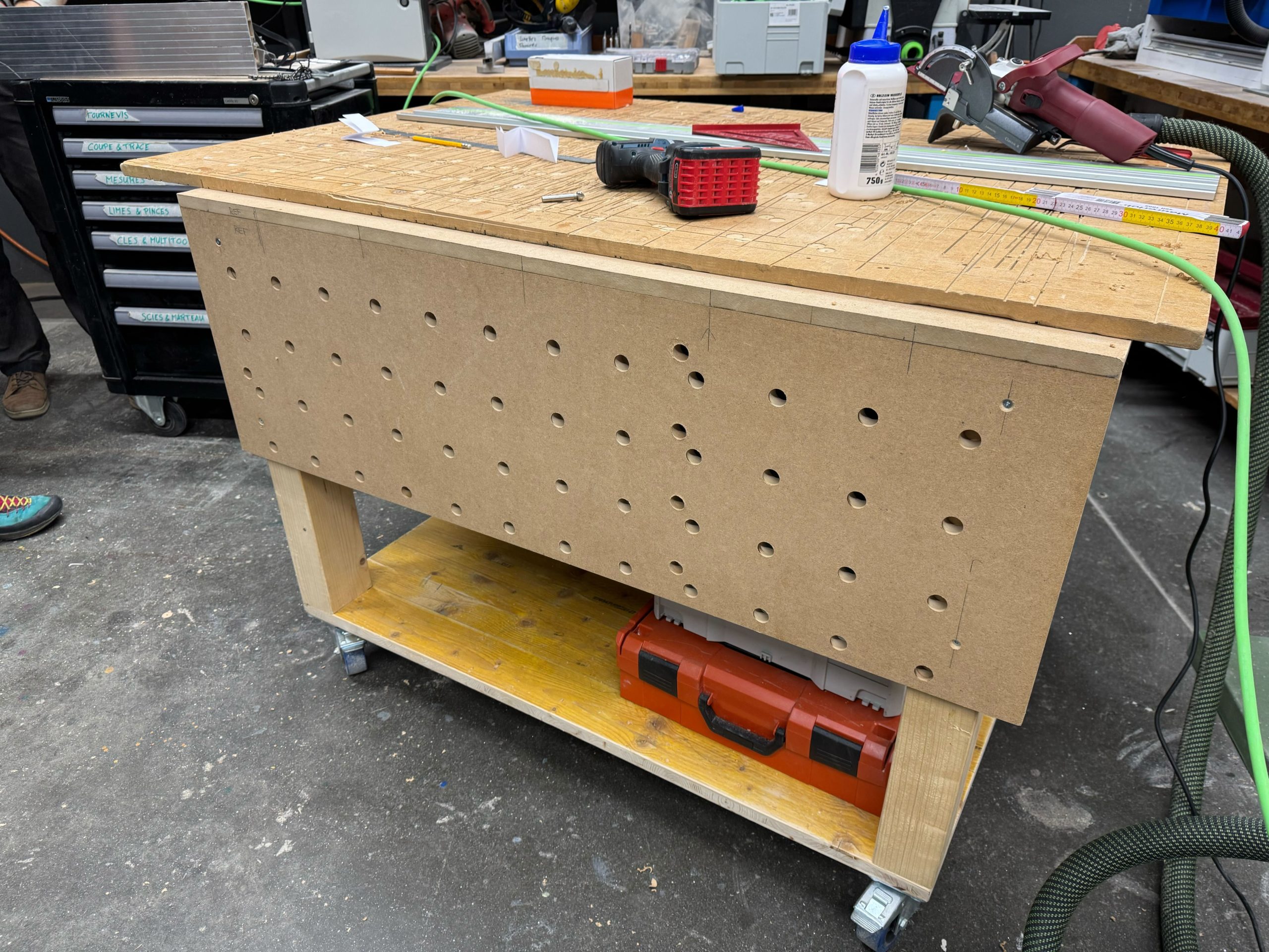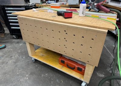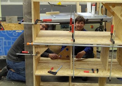 Après le déménagement à Sport 5, une plus grande surface pour le travail du bois a permis l’introduction de nouvelles machines: la scie à panneaux, la scie sur table, la scie à ruban et la dégauchisseuse-raboteuse. Ces outils sont essentiels réaliser des meubles et des projets d’envergure. En mai 2024, la cloison délimitant les zones bois et métal a été montée pour atténuer le bruit et éviter la propagation de la poussière. En fin d’année 2024, l’établi est construit sur plusieurs mois. Il est équipé d’espaces de rangements pour les machines portatives et d’une planche à trou compatible avec le système MFT. Durant l’année 2025, le meuble de tri des déchets a mobilisé le groupe pour la coupe des panneaux d’OSB (récupérés à l’EPFL), le montage des boîtes, les portes, l’usinage CNC des ouvertures et leur encadrement.